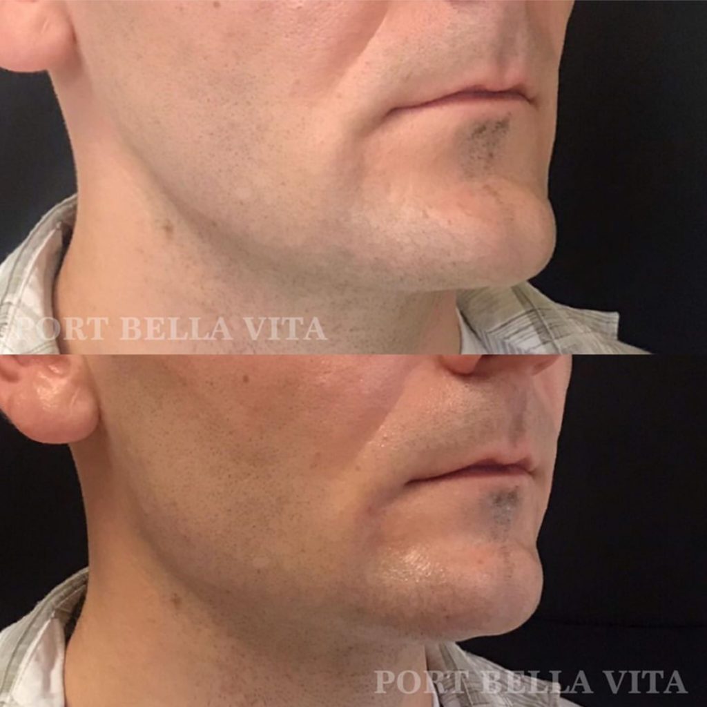 A képen látható esetben férfi vendégünk kezelésénél a karakteres férfi kontúr kialakításához a fül előtti és áll területek kezelését is szükséges volt elvégezni, melynek érdekében a Juvederm Volux-ot Juvederm Volumaval is kiegészítettük.